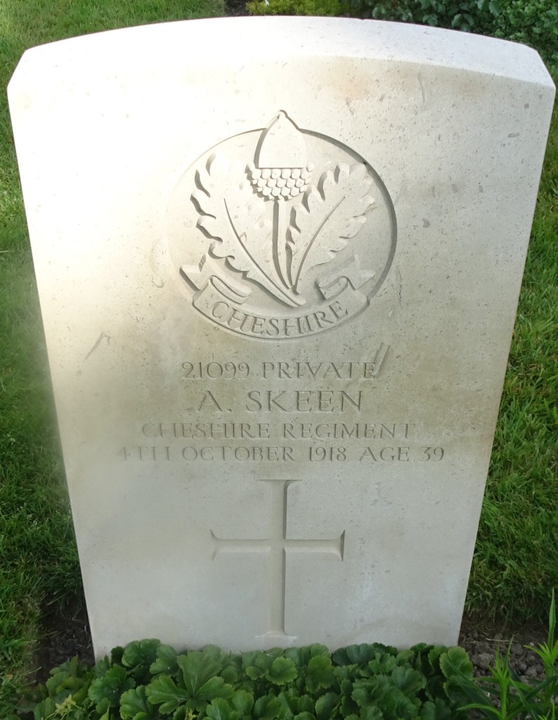 4/10/1918 Private Alfred Skeen (Age 39) 15th Bn. Lijssenthoek Military Cemetery, West-Vlaanderen Belgium. ‘21099’ Son of David and Camelia Skeen; husband of Elizabeth E. Skeen, of 84, Church Way, North Shields. Born North Shields.