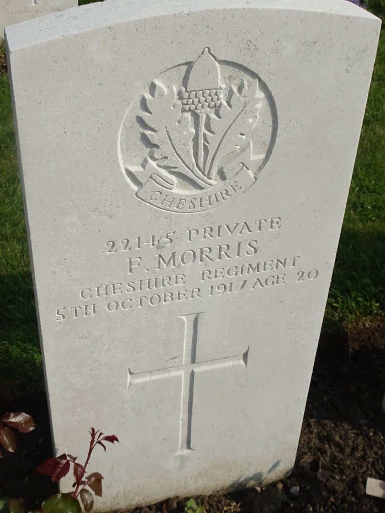 1917 18 5/10/1917 Private Frank Morris (Age 20) 1st Bn. Tyne Cot Cemetery, West-Vlaanderen Belgium. ‘22145’ Son of Robert H. Morris, of 2, Willow Cottage, Borough Rd., Seacombe, Cheshire.