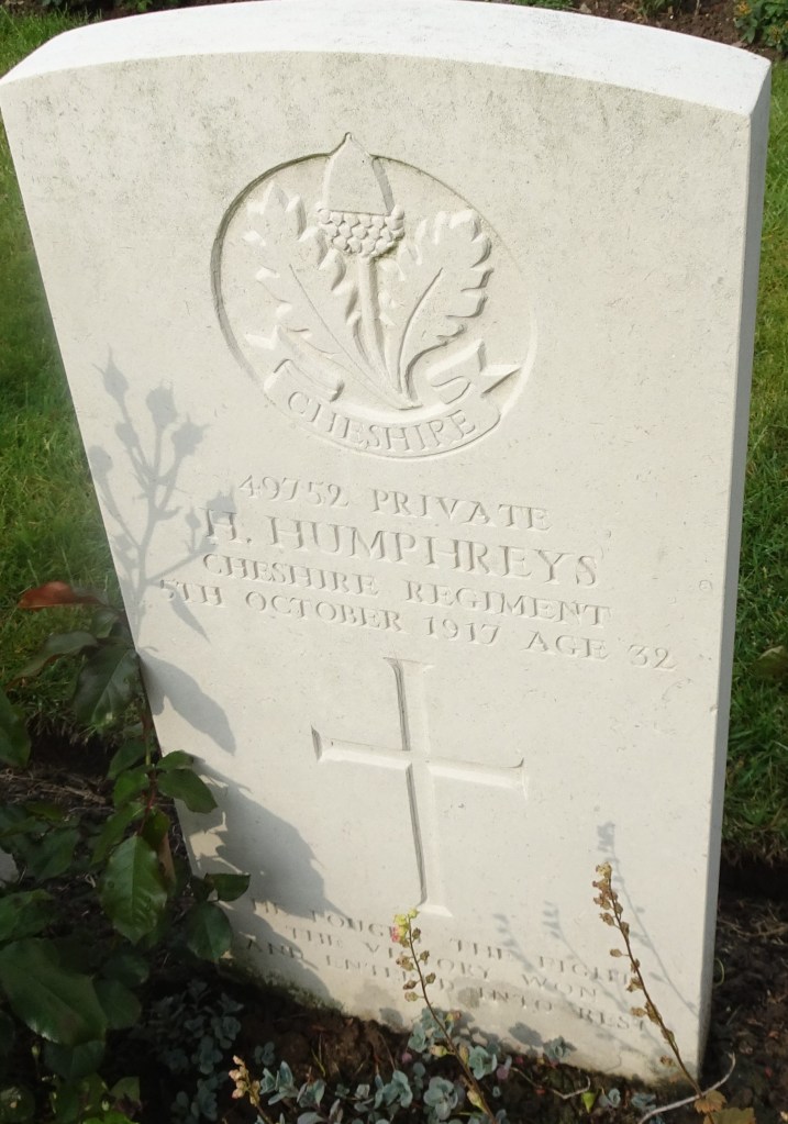 05/10/1917 Private Harry Humphreys (Age 32) 1st Bn. Tyne Cot Cemetery, West-Vlaanderen Belgium. ‘49752’ Son of George and Mary Humphreys, of High St., Bangor on Dee, Wrexham.