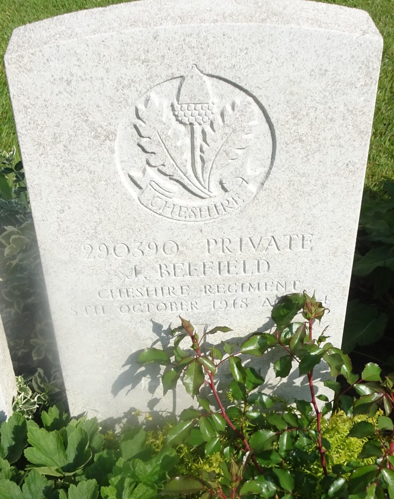 05/10/1918 Private John Belfield (Age 24) 1st/7th Bn. Lijssenthoek Military Cemetery, West-Vlaanderen Belgium. ‘290390’ Son of the late Mr. and Mrs. Belfield, of Macclesfield, Cheshire.