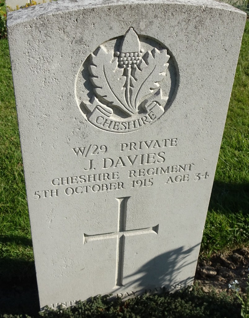 05/10/1915 Private John Davies (Age 34) No. 1 Coy. 13th Bn. Tancrez Farm Cemetery, Hainaut Belgium. ‘W/29’ Son of William and Susannah Davies, of Greasley, Cheshire; husband of Mary Jones (formerly Davies), of 6, Big Yard, Wallasey, Cheshire.