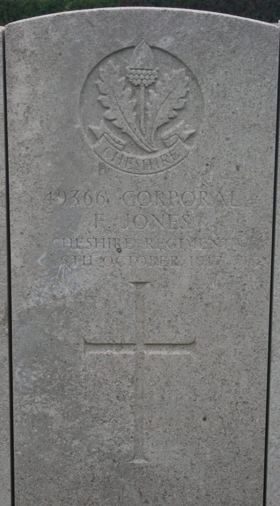 6/10/1917 Corporal Fred Jones 1st Bn. Godewaersvelde British Cemetery, Nord France. ‘49366’ Son of Mr. E. Jones, of 40, Windmill St., Macclesfield. (pic from findagrave.com. – with thanks)