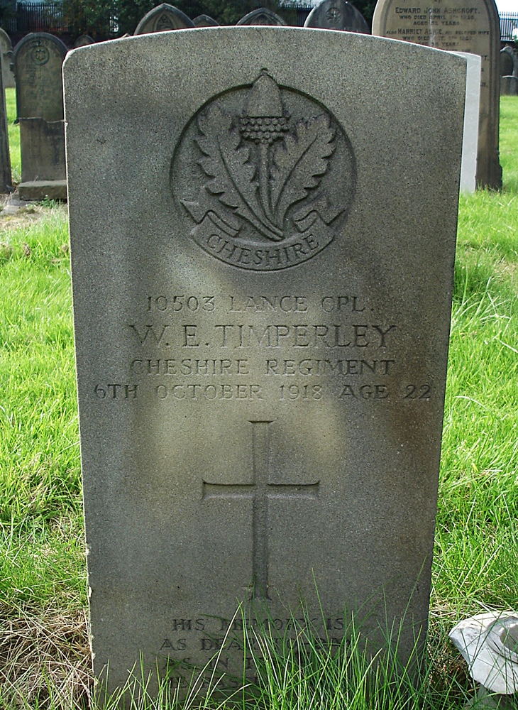 6/10/1918 Lance Corporal William Ezra Timperley (Age 22) 3rd Bn. Salford (Weaste) Cemetery, Lancashire United Kingdom. ‘10503’ Son of J. W. and Ellen Timperley, of 28, Gloucester St., Salford. Born at Sale, Cheshire. (pic from findagrave.com. – with thanks)
