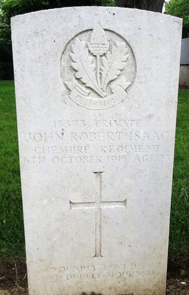 6/10/1915 Private John Robert Isaac (Age 23) “A” Coy. 12th Bn. St. Pierre Cemetery, Amiens, Somme France. ‘13333’ Son of John and Mary Elizabeth Isaac, of 22, Park Rd., Tranmere, Birkenhead. (pic from findagrave.com. – with thanks)