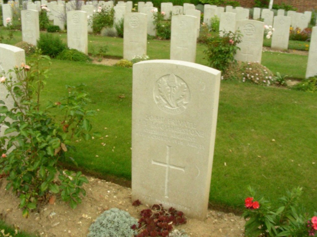 6/10/1916 Private John Thomas Bootherstone (Age 35) 16th Bn. Faubourg D’amiens Cemetery, Arras, Pas de Calais France. ‘20411’ Husband of Amelia Harvey (formerly Bootherstone), of 106, Wood St., Longton, Staffs. (pic from findagrave.com. – with thanks)