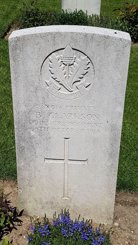 6/10/1918 Private Benjamin Clarkson 10th Bn. Montcornet Military Cemetery, Aisne France. ‘263016’ (pic from findagrave.com. – with thanks)