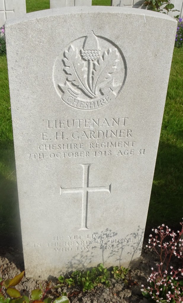 7/10/1918 Lieutenant Ellis Hubert Gardiner (Age 31) “A” Coy. 1st/7th Bn. Lijssenthoek Military Cemetery, West-Vlaanderen Belgium. Son of John and Mary Elizabeth Gardiner, of Bollington, Cheshire. M.A. of Balliol College, Oxford.