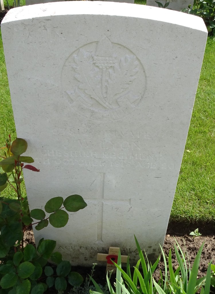7/10/1918 Private John William Lyon (Age 20) 1st/4th Bn. Menin Road South Military Cemetery, West-Vlaanderen Belgium. ‘67812’ Son of Mr. and Mrs. Lyon, of 309, Bolton Rd., Stubshaw Cross, Ashton-in-Makerfield, Wigan.
