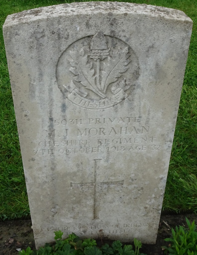 7/10/1918 Private Maurice Joseph Morahan (Age 32) “A” Coy. 1st/4th Bn. Zantvoorde British Cemetery, West-Vlaanderen Belgium. ‘50311’ Son of William and Nora Morahan, of Clonmore, Piltown, Co. Kilkenny.