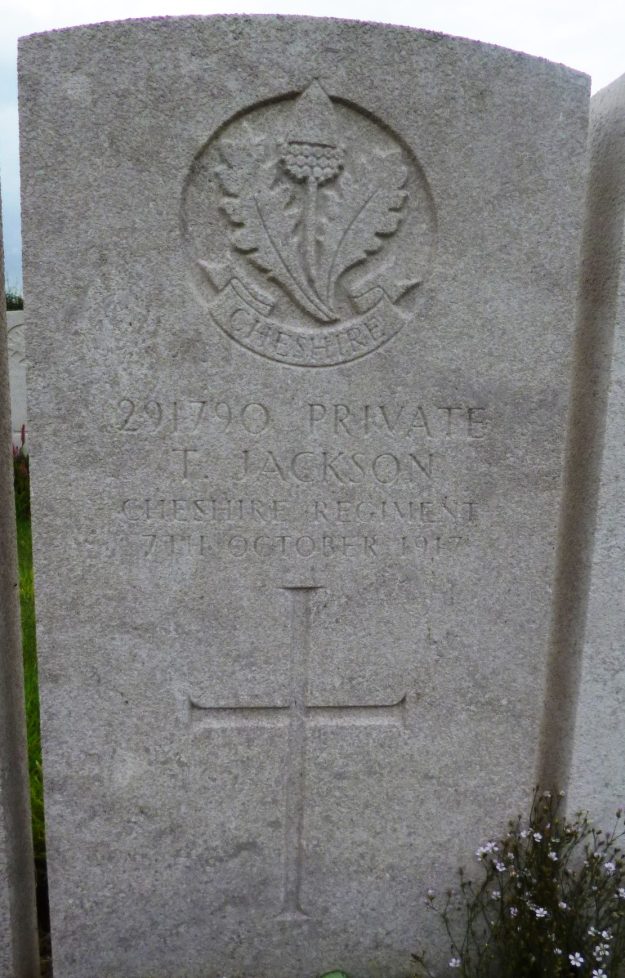 7/10/1917 Private Thomas Jackson 1st Bn. Godewaersvelde British Cemetery, Nord France. ‘291790’ Husband of K. Jackson, of 17, Chapel St., Sandbach, Cheshire. (pic from findagrave.com. – with thanks)