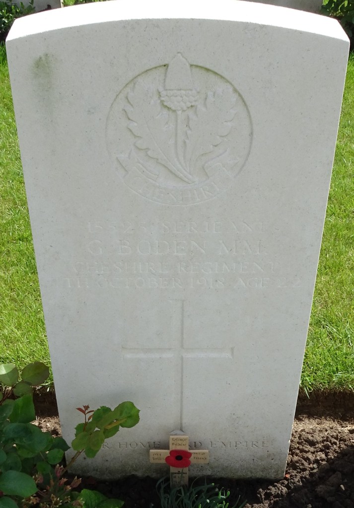 7/10/1918 Serjeant George Boden (Age 22) MM 1st/4th Bn. Menin Road South Military Cemetery, West-Vlaanderen Belgium. ‘15525’ Son of Charles and Annie Boden, of 8, William St., Northwich, Cheshire.