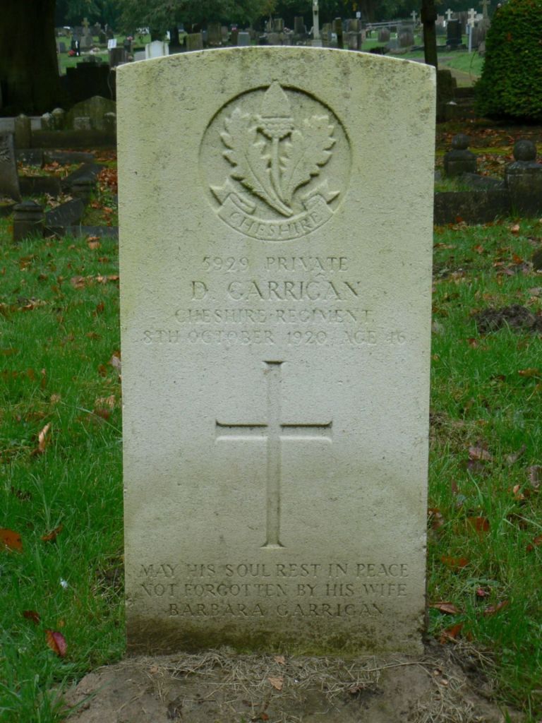 8/10/1920 Private Daniel Garrigan (Age 46) Wrexham Cemetery, Denbighshire United Kingdom. ‘5929’ Son of Daniel Garrigan and Mary Garrigan; husband of Barbara Garrigan, of 16, Victor St., Boughton, Chester. Born at Wrexham. (pic from findagrave.com. – with thanks)