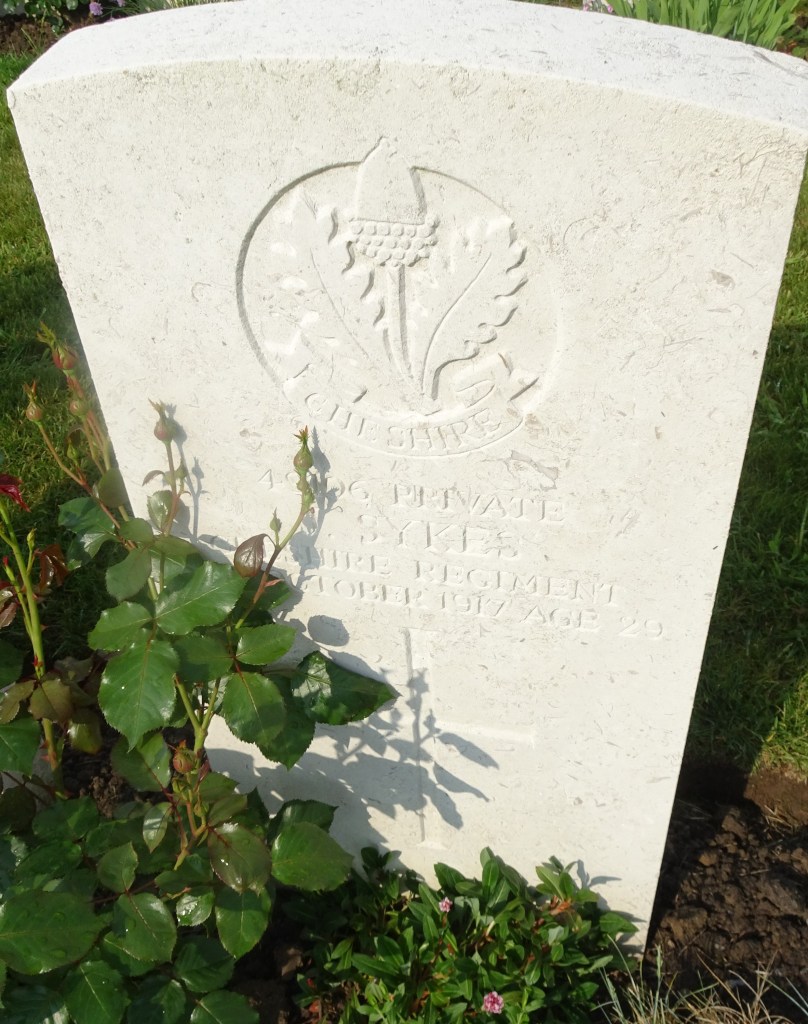 8/10/1917 Private Joseph Sykes (Age 29) 1st Bn. Tyne Cot Cemetery, West-Vlaanderen Belgium. ‘49106’ Son of John and Mary Alice Sykes, of 5, Mossley Rd., Heyrood, Stalybridge.