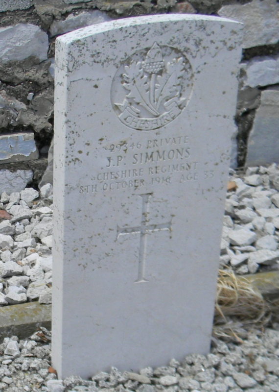8/10/1916 Private John Philip Simmons (Age 33) 1st Garrison Bn. Gibraltar (North Front) Cemetery, Gibraltar. ‘29346’ Son of Thomas James and Mary Ann Simmons, of 27, Beamont St., West Bank, Widnes. (pic from findagrave.com. – with thanks)
