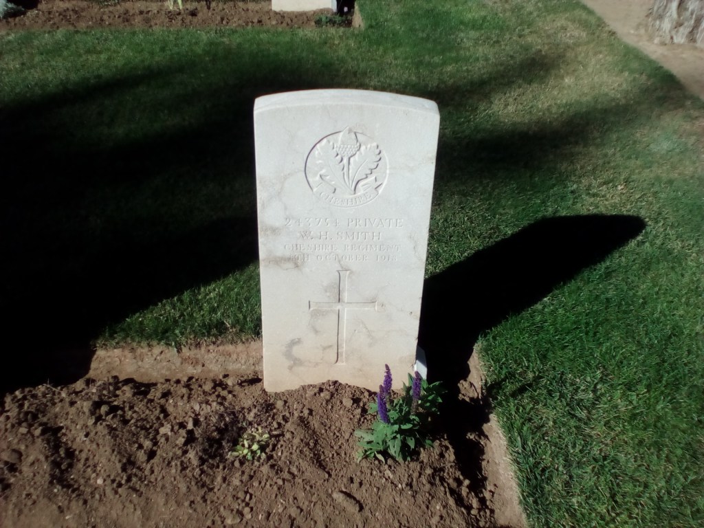 8/10/1918 Private William Henry Smith (Age 40) 2nd Bn. Salonika (Lembet Road) Military Cemetery, Greece. ‘243754’ Son of Mrs. Roberts, of Wallasey; husband of Martha E. Jackson (formerly Smith), of 16, Mersey St., Seacombe, Wallasey, Cheshire. (pic from findagrave.com. – with thanks)