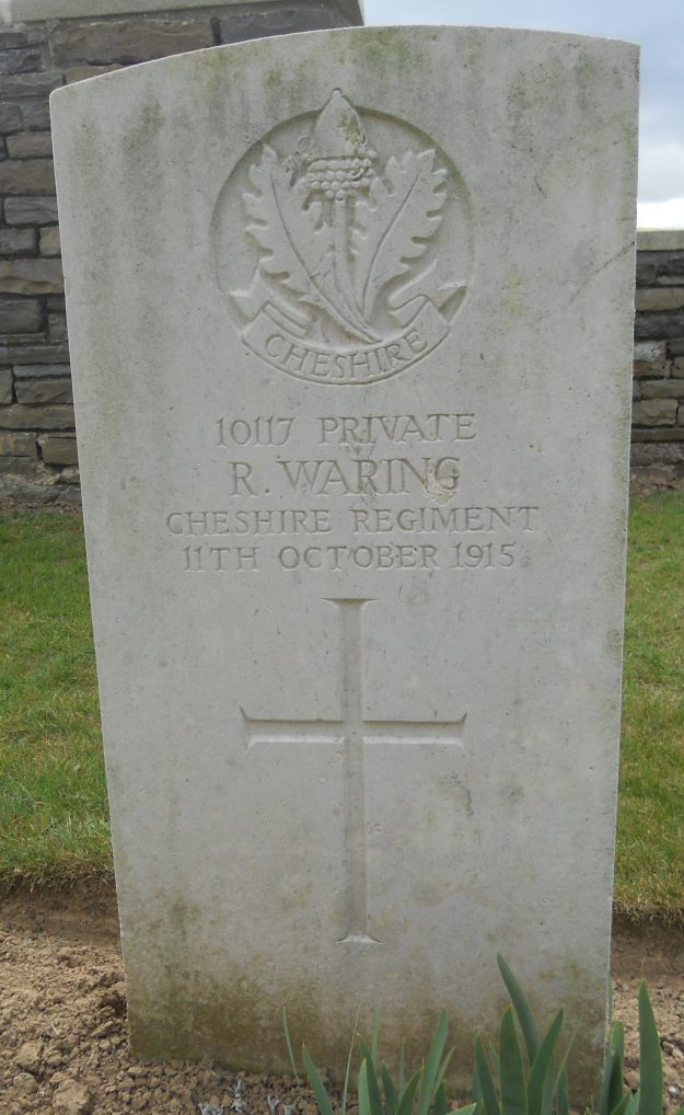 11/10/1915 Private Richard Waring 1st Bn. Citadel New Military Cemetery, Fricourt, Somme France. ‘10117’ (pic from findagrave.com. – with thanks)