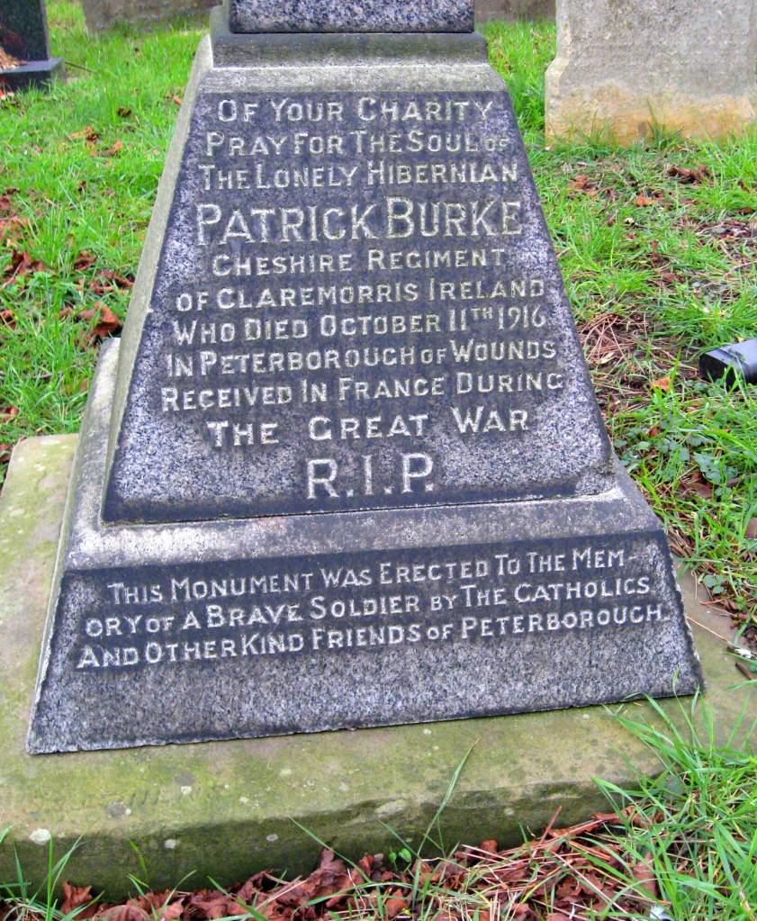 11/10/1916 Private Patrick Burke 1st Bn. Peterborough Old (Broadway) Cemetery, Northamptonshire United Kingdom. ‘33550’ (pic from findagrave.com. – with thanks)