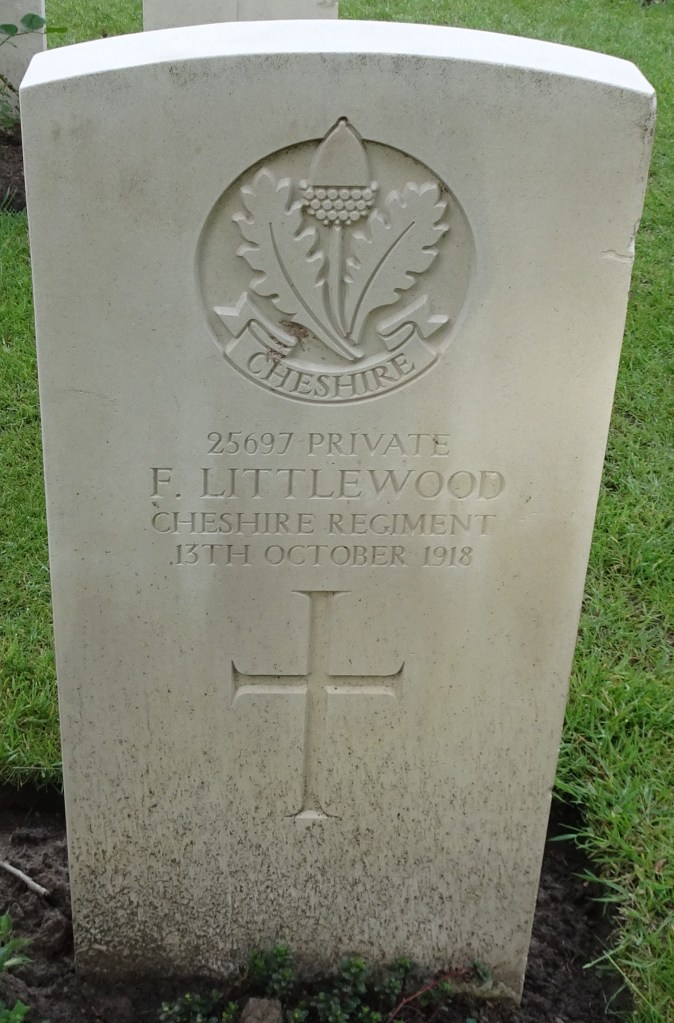 13/10/1918 Private Frederick Littlewood 15th Bn. Ypres Reservoir Cemetery, West-Vlaanderen Belgium. ‘25697’