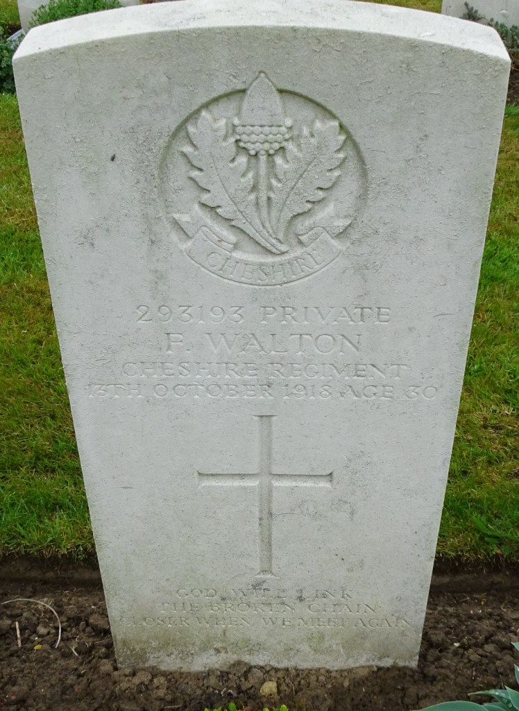 13/10/1918 Private Fred Walton (Age 30) 1st/7th Bn. Perth Cemetery (China Wall), West-Vlaanderen Belgium. ‘293193’ Son of James and Emma Walton, of 31, Crow Lane, Ramsbottom, Manchester.