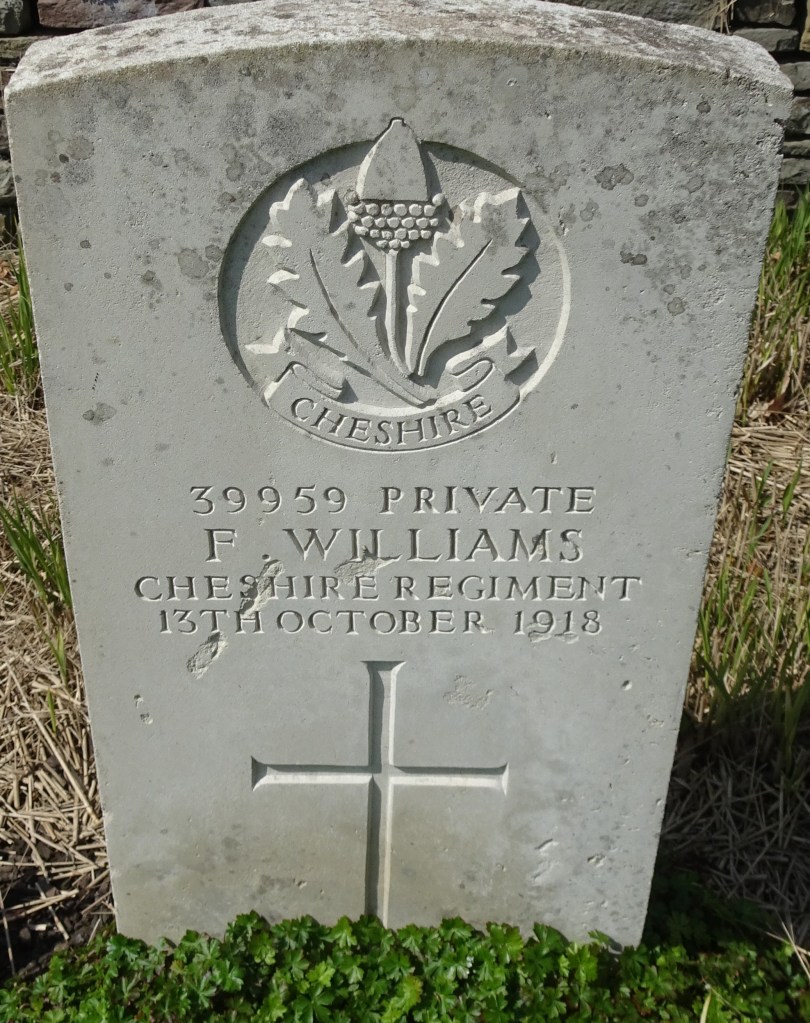 13/10/1918 Private John Harding Depot Bebington Cemetery, Cheshire United Kingdom. ‘49663’ 13/10/1919 Private R Jones 1st Bn. Clynnog Fawr (St. Beuno) Churchyard, Caernarvonshire United Kingdom. ‘68521’ (pic from findagrave.com. – with thanks)