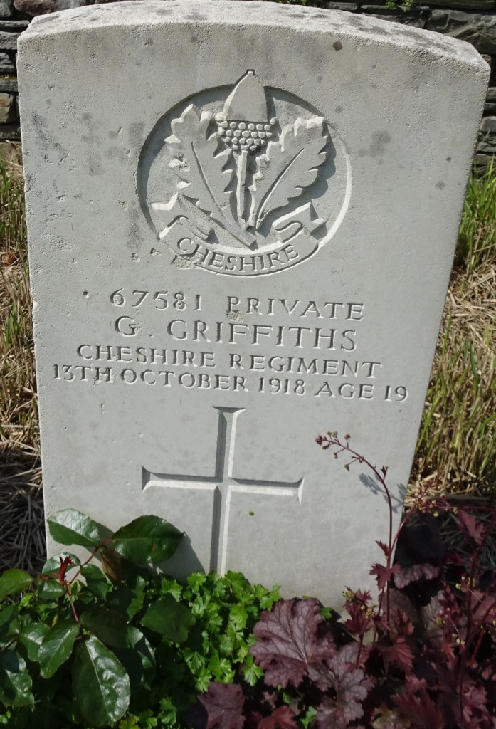 13/10/1918 Private Griffith Griffiths (Age 19) 15th Bn. Dadizeele New British Cemetery, West-Vlaanderen Belgium. ‘67581’ Son of Richard and Ann Griffiths, of 24, Old Post Office Terrace, Abar-Erch, Pwllheli, Carnarvonshire.