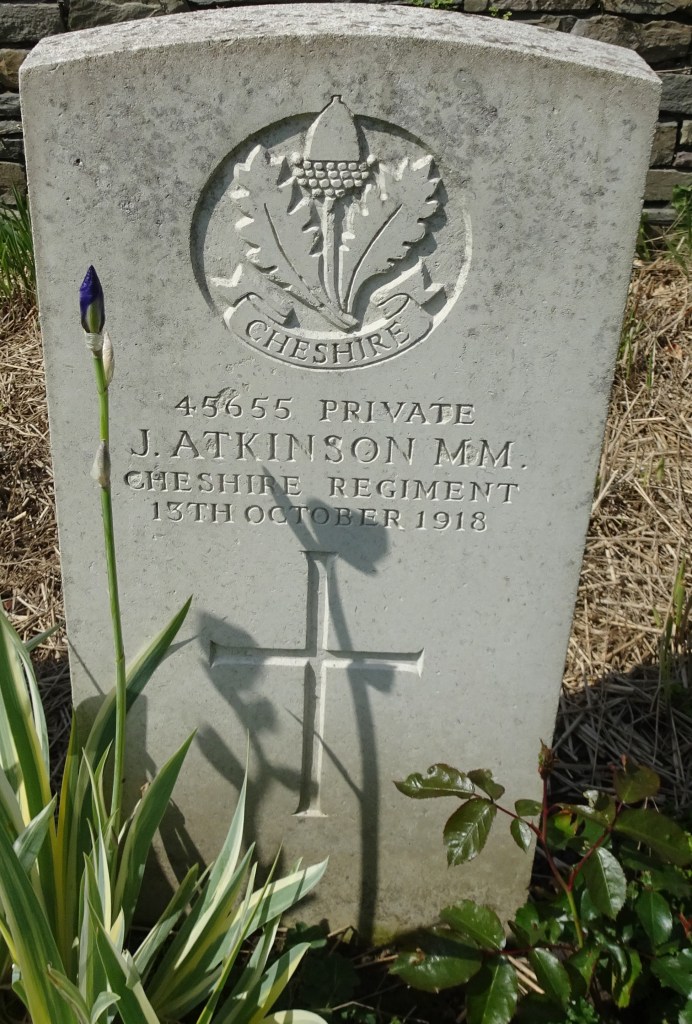 13/10/1918 Private John Atkinson MM 15th Bn. Dadizeele New British Cemetery, West-Vlaanderen Belgium. ‘45655’ Son of Mr. J. Atkinson, of 3, John St., Hyde, Cheshire.