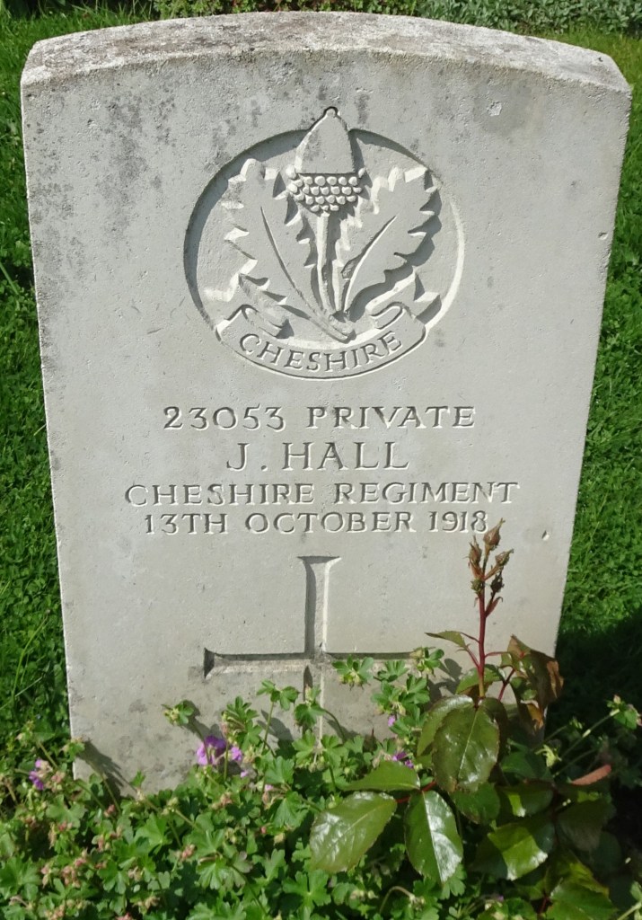 13/10/1918 Private James Hall 15th Bn. Dadizeele New British Cemetery, West-Vlaanderen Belgium. ‘23053’ Son of Mr. J. Hall, of 7, Atkin St., Dukinfield, Cheshire.