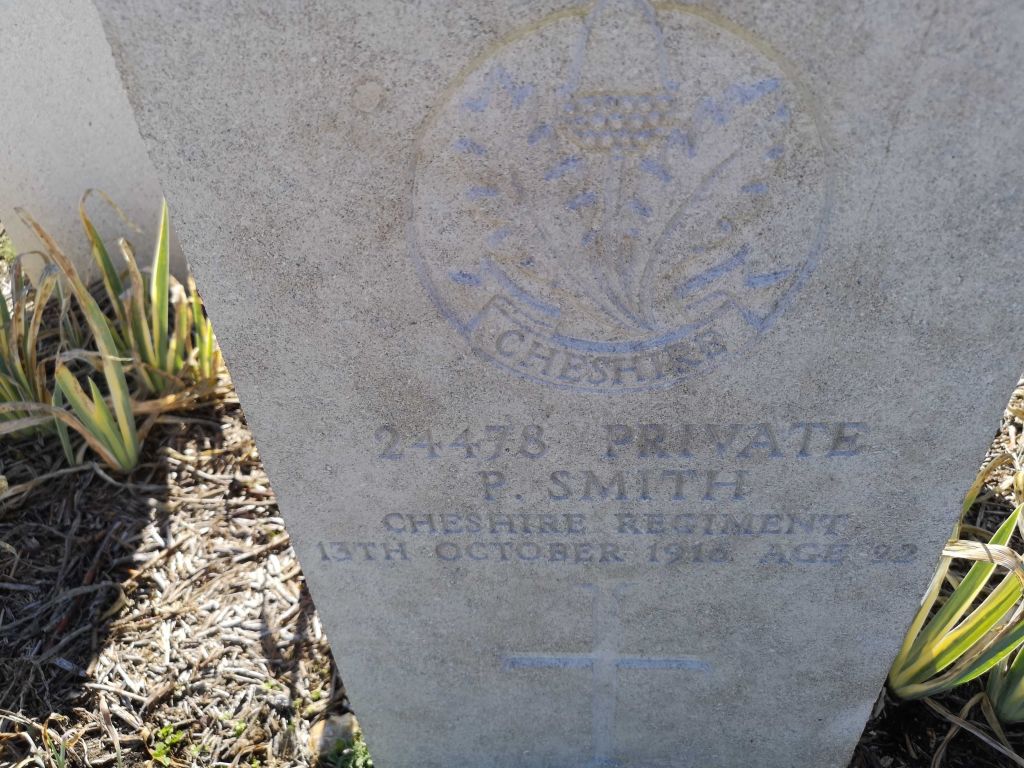 13/10/1916 Private Percy Smith (Age 22) 11th Bn. St. Sever Cemetery, Rouen, Seine-Maritime France. ‘24478’ Son of John George and Martha Smith, of Carr Farm, Saughall Massie, Birkenhead. (pic from findagrave.com. – with thanks)