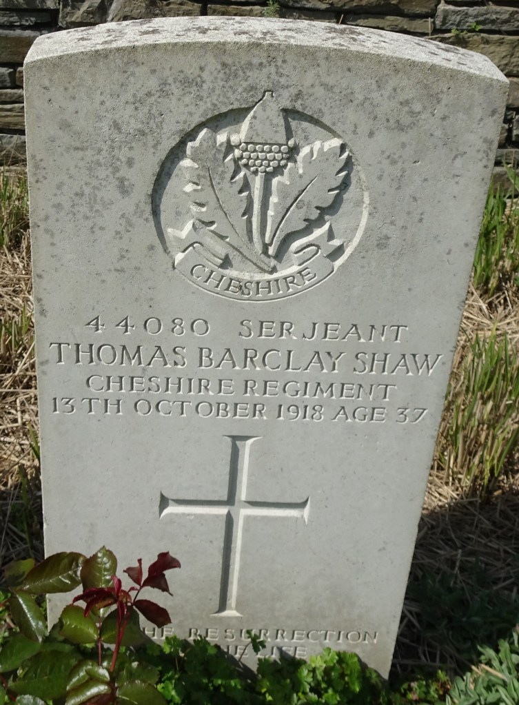 13/10/1918 Serjeant Thomas Barclay Shaw (Age 37) “Z” Coy. 15th Bn. Dadizeele New British Cemetery, West-Vlaanderen Belgium. ‘44080’ Son of Mary Shaw, of Birkenhead, and the late Aaron Shaw; husband of Joan Isabel Shaw, of 6, Sycamore Rd., Higher Tranmere, Birkenhead.