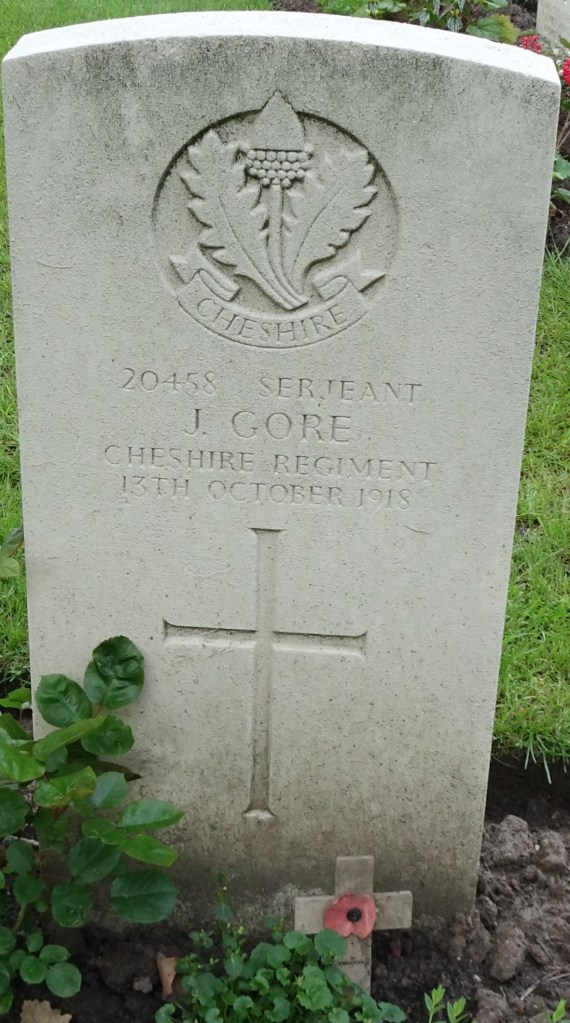 13/10/1918 Serjeant James Gore 15th Bn. Ypres Reservoir Cemetery, West-Vlaanderen Belgium. ‘20458’ Son of Mrs. Mary Gore, of 12, Napier St., Preston.