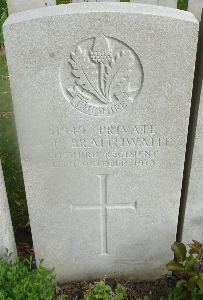 15/10/1918 Private Alfred Frecerick Braithwaite 1st/7th Bn. Lijssenthoek Military Cemetery, West-Vlaanderen Belgium. ‘51949’