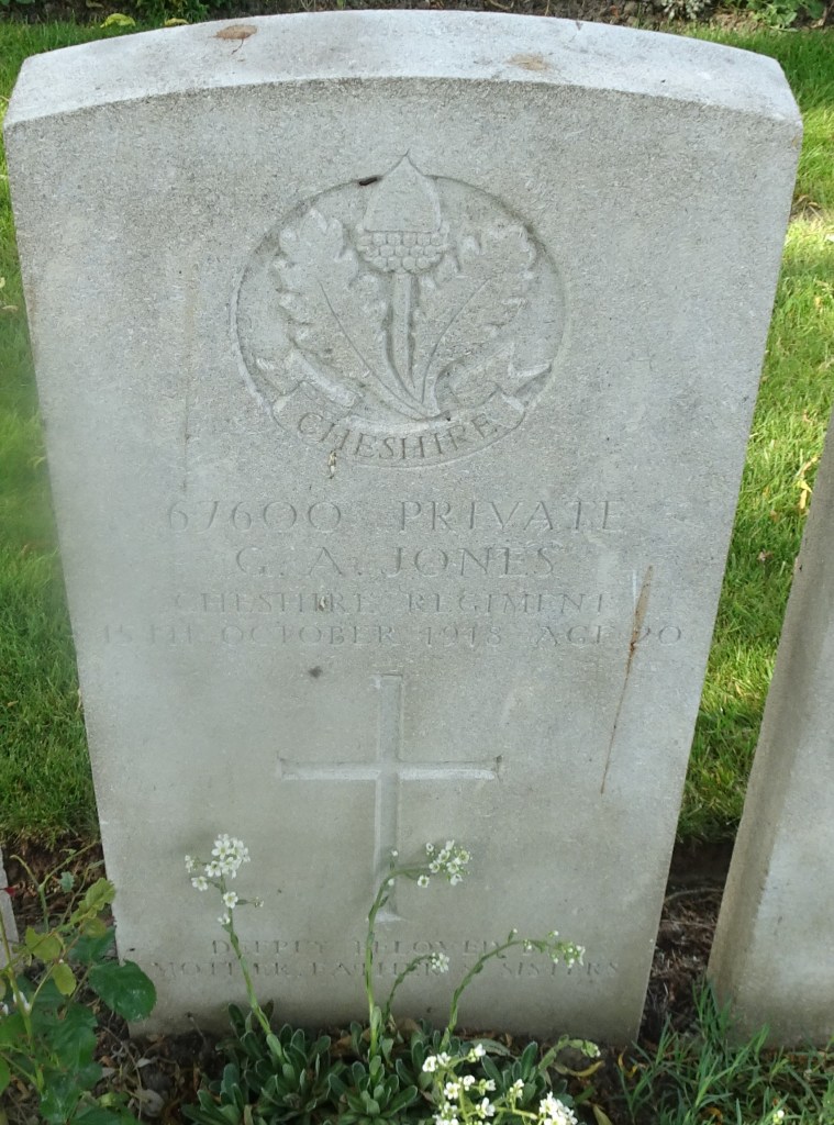 15/10/1918 Private George Albert Jones (Age 20) “C” Coy. 15th Bn. Lijssenthoek Military Cemetery, West-Vlaanderen Belgium. ‘67600’ Son of Thomas and Ann Elizabeth Jones, of Trederwen, Bytake, Llandrinio, Montgomeryshire.