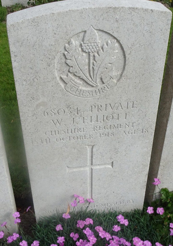 15/10/1918 Private William John Elliott (Age 18) 1st/4th Bn. Lijssenthoek Military Cemetery, West-Vlaanderen Belgium. ‘68034’ Son of John and Elizabeth Mona Elliott, of 30, Buck’s Rd., Douglas, Isle of Man.