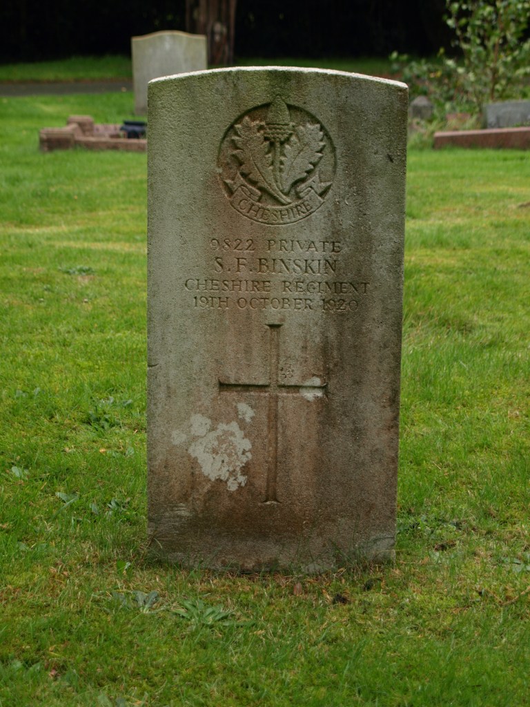 19/10/1920 Private Samuel (?) Binskin Wellington General Cemetery, Shropshire, Shropshire United Kingdom. ‘9822’ (pic from findagrave.com – with thanks)