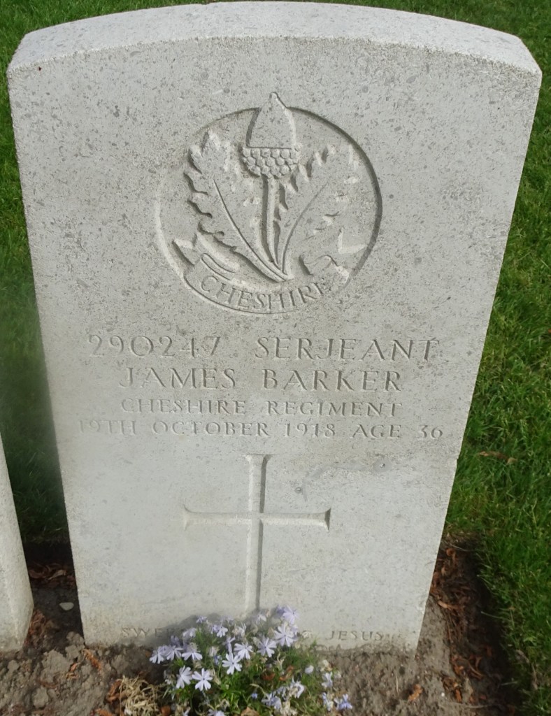 19/10/1918 Serjeant James Barker (Age 36) “B” Coy. 1st/7th Bn. Lijssenthoek Military Cemetery, West-Vlaanderen Belgium. ‘290247’ Husband of Ellinor Barker, of 69, Astbury St., Congleton, Cheshire.