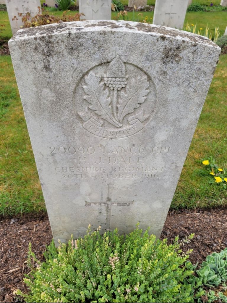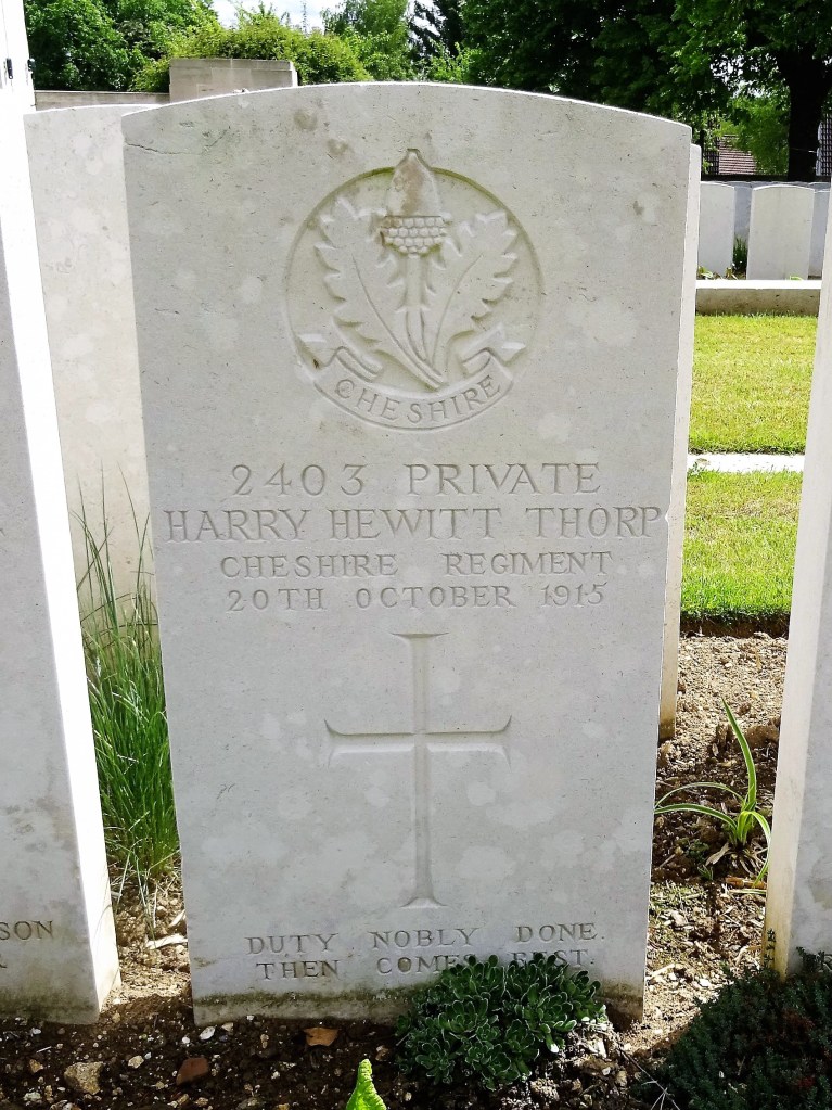 20/10/1915 Private Harry Hewitt Thorp (Age 27) 5th Bn. Corbie Communal Cemetery, Somme France. ‘2403’ Son of F. M. and A. Thorp, of 21, Victoria Rd., Chester. (pic from findagrave.com – with thanks)