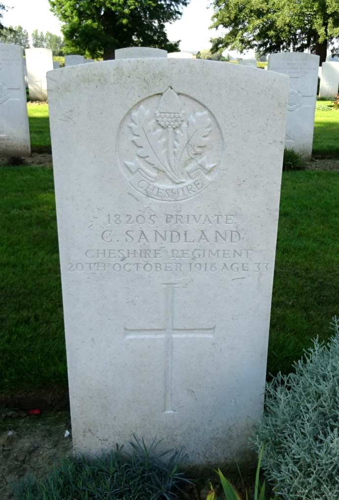 20/10/1916 Private Charles Sandland (Age 33) 1st Bn. Le Touret Military Cemetery, Richebourg-L’avoue, Pas de Calais France. ‘18205’ Son of Thomas Sandland, of 39, Albert St., Princes End, Tipton, Staffs. (pic from findagrave.com – with thanks)