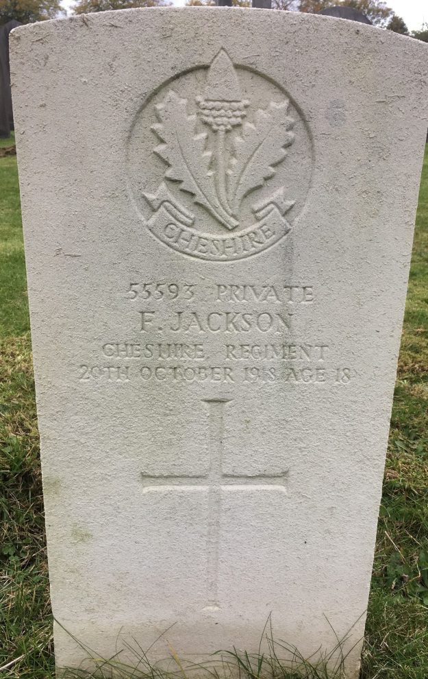 20/10/1918 Private Frank Jackson (Age 18) 53rd Bn. Sale Cemetery, Cheshire United Kingdom. ‘55593’ Son of James and Alice Jackson, of 4, North View, Broad Rd., Sale. (pic from findagrave.com – with thanks)