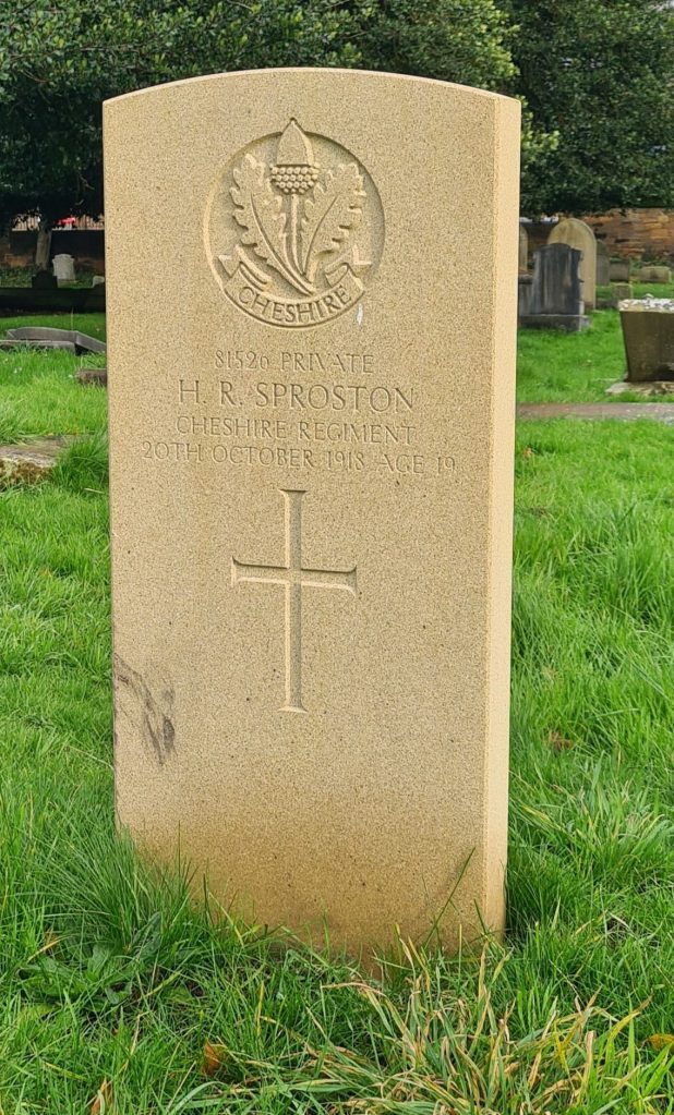 20/10/1918 Private Herbert Rees Sproston (Age 19) “C” Coy. 3rd Bn. Birkenhead (Flaybrick Hill) Cemetery, Cheshire United Kingdom. ‘81526’ Son of John and Eliza Sproston, of 13, Bray St., Birkenhead. (pic from findagrave.com – with thanks)