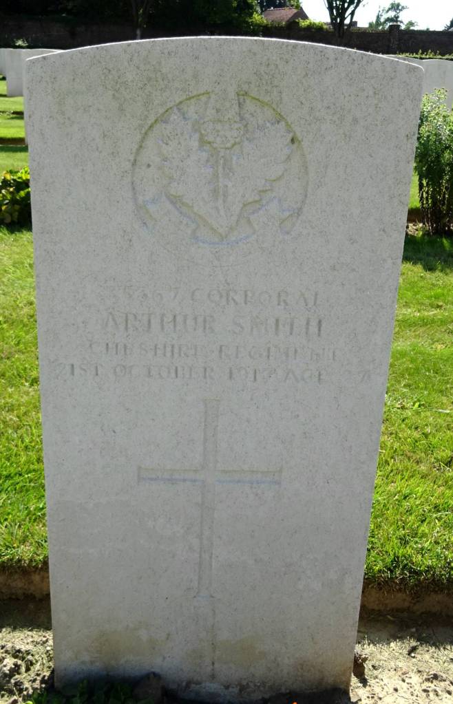 21/10/1917 Corporal Arthur Smith (Age 27) 11th Bn. Cambrin Military Cemetery, Pas de Calais France. ‘35367’ Son of George Frank and Elizabeth Smith, of 79, Banks Lane, Stockport. (pic from findagrave.com – with thanks)