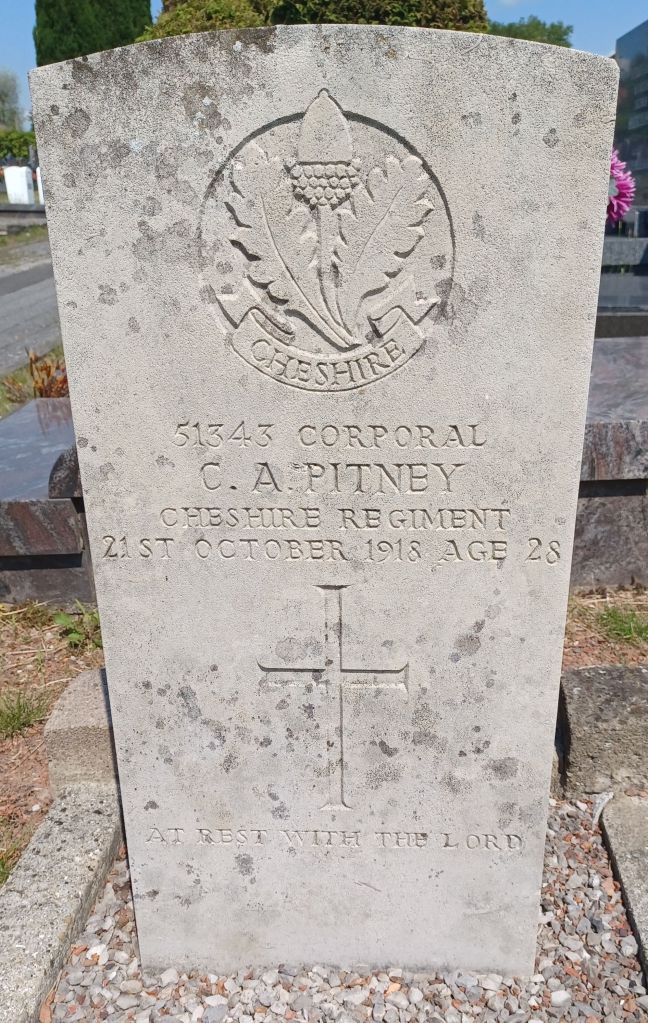 21/10/1918 Corporal Charles Alfred Pitney (Age 28) 1st/6th Bn. Roncq Communal Cemetery, Nord France. ‘51343’ Son of Mary Ann Pitney, of 89, Virginia Park Rd., Worthing, Sussex, and the late Alfred James Pitney. (pic from findagrave.com – with thanks)