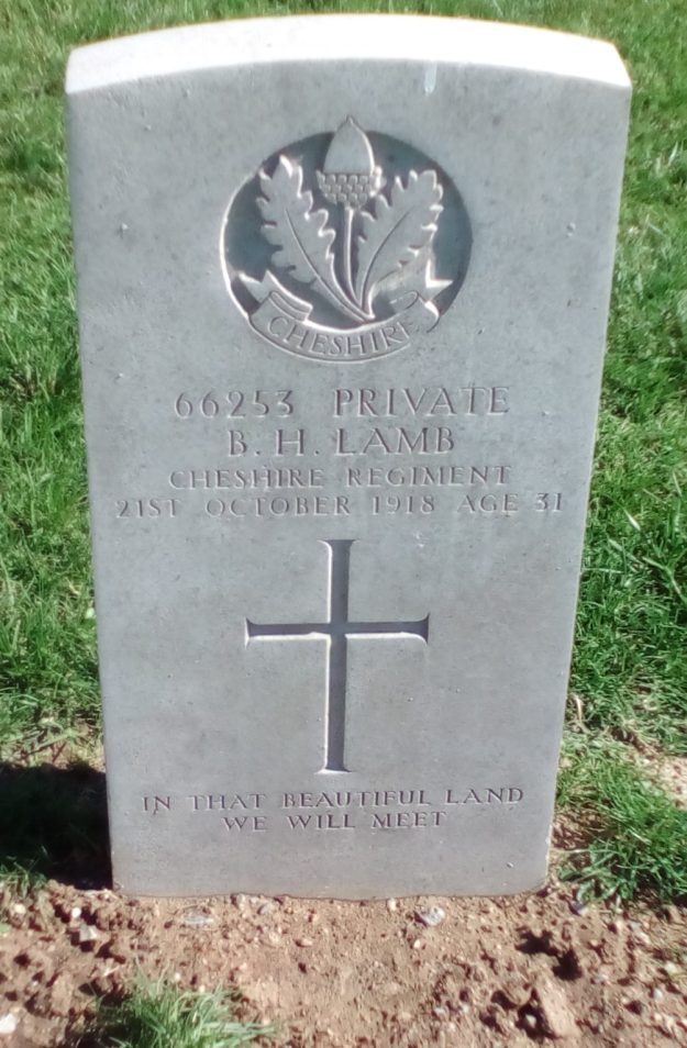 21/10/1918 Private Basil Henry Lamb (Age 31) 2nd Bn. Kirechkoi-Hortakoi Military Cemetery, Greece. ‘66253’ Husband of D. L. Lamb, of 46, Gosterwood St., Deptford, London. (pic from findagrave.com – with thanks)