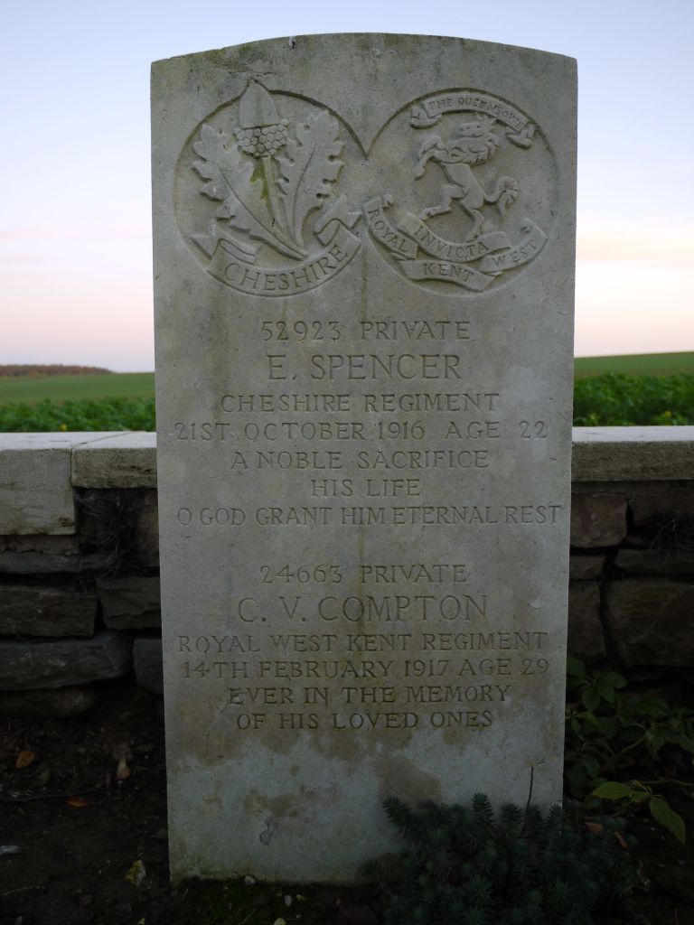 21/10/1916 Private Ernest Spencer (Age 22) 13th Bn. Stump Road Cemetery, Grandcourt, Somme France. ‘52923’ Son of Ernest and Martha Hannah Spencer, of 13 Church St., Hyde. (pic from findagrave.com – with thanks)
