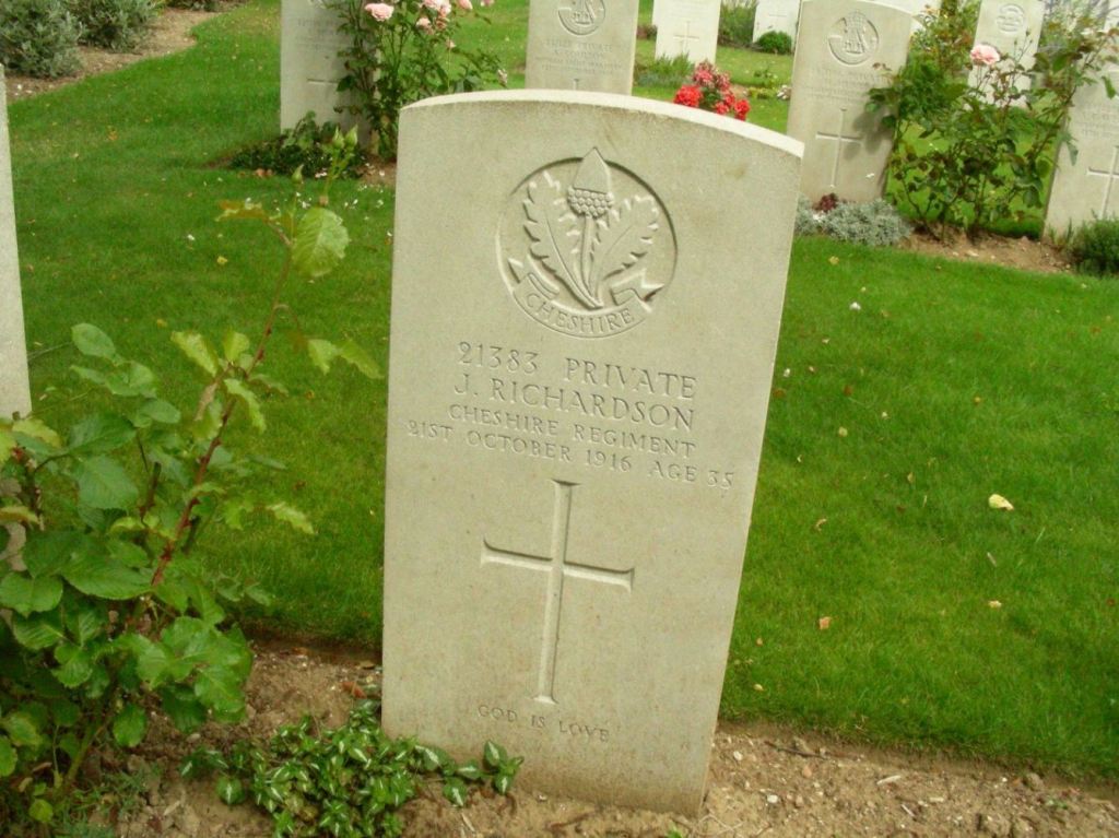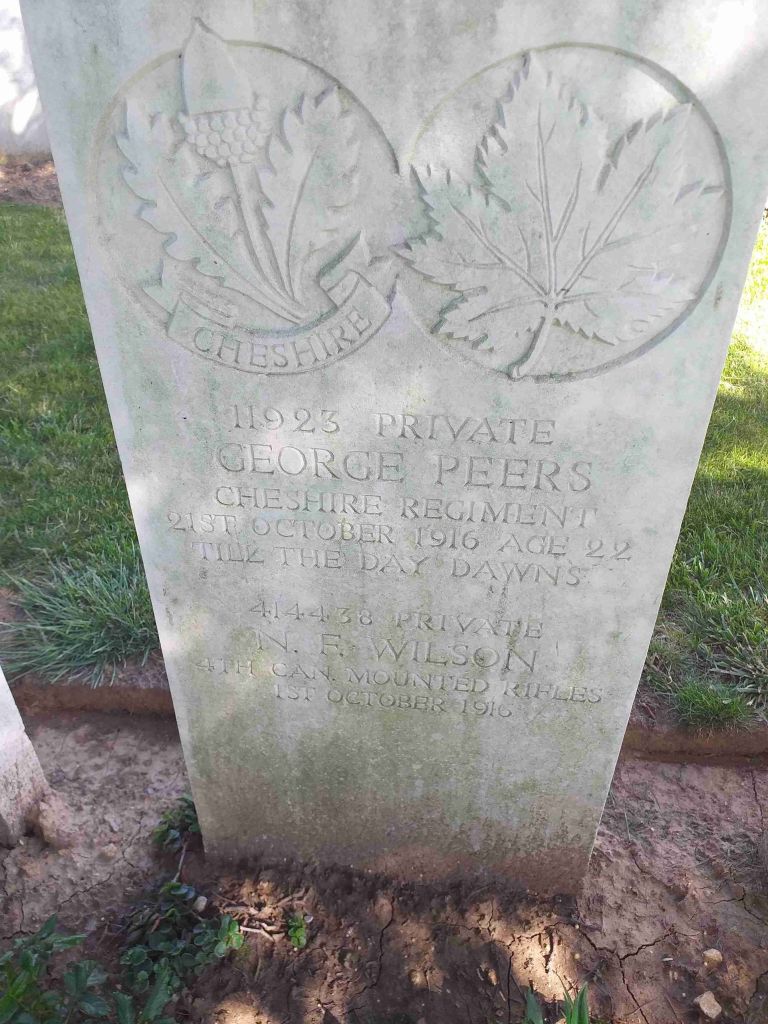 21/10/1916 Private George Peers (Age 22) 13th Bn. Stump Road Cemetery, Grandcourt, Somme France. ‘11923’ Son of Benjamin and Charlotte Peers, of 33, Livingstone Rd., Ellesmere Port, Birkenhead. (pic from findagrave.com – with thanks)