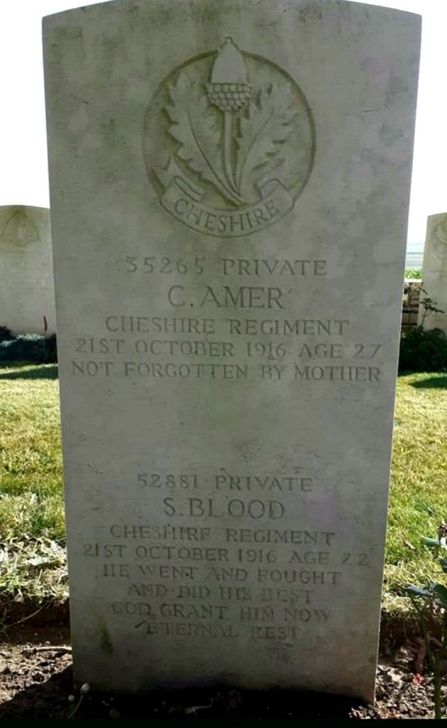 21/10/1916 Private Charles Amer (Age 27) 13th Bn. Stump Road Cemetery, Grandcourt, Somme France. ‘35265’ Son of Stephen Knott Amer and Mary Jane Amer, of 10, Old Priory, Birkenhead, Cheshire. (pic from findagrave.com – with thanks)
