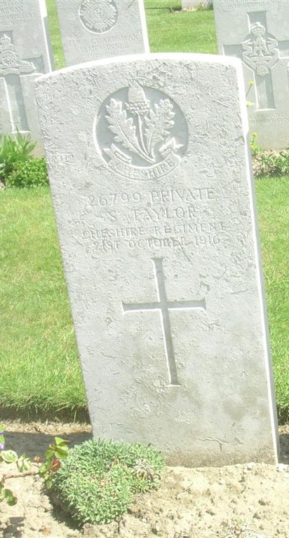 21/10/1916 Private Seth Taylor (Age 38) 11th Bn. Etaples Military Cemetery, Pas de Calais France. ‘26799’ Son of George and Hannah Taylor; husband of E. Taylor, of 3, Royles Cottages, South Grove, Brooklands, Manchester. (pic from findagrave.com – with thanks)