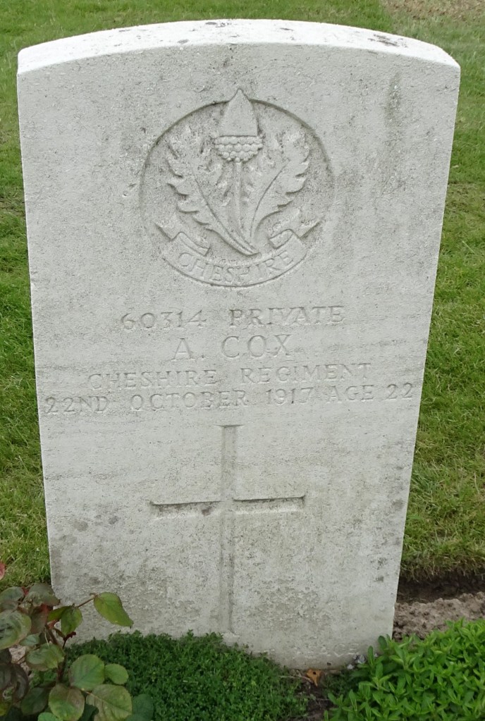 22/10/1917 Private Alfred Cox (Age 22) 16th Bn. Poelcapelle British Cemetery, West-Vlaanderen Belgium. ‘60314’ Son of Benjamin and Margaret Cox, of 9, Newark St., Woodhouse Lane, Wigan.
