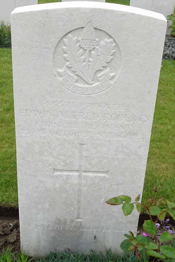 22/10/1917 Private Edwin Alfred Roberts (Age 22) 16th Bn. Bedford House Cemetery, West-Vlaanderen Belgium. ‘45571’ Son of Edwin and Elizabeth A. Roberts, of 7, Hampton St., Birkenhead.