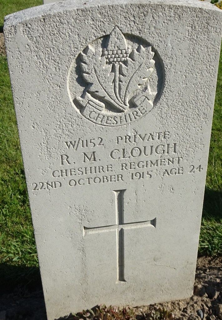 22/10/1915 Private Robert Moss Clough (Age 24) 13th Bn. Tancrez Farm Cemetery, Hainaut Belgium. ‘W/1152’ Son of George James and Margaret Alice Clough.