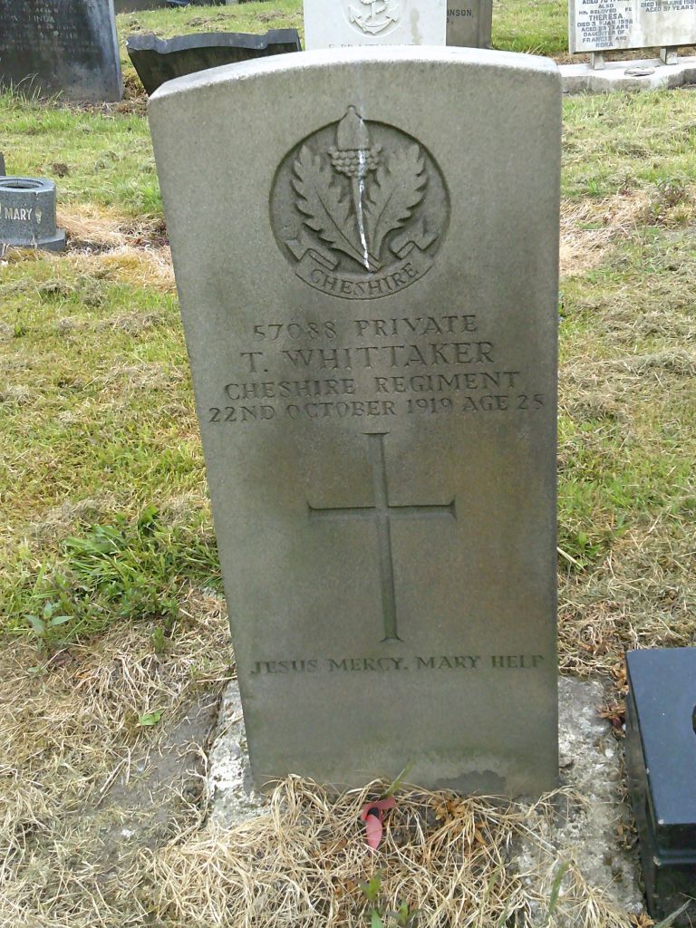 22/10/1919 Private Thomas Whittaker (Age 25) “A” Coy. 6th Bn. Salford (Weaste) Cemetery, Lancashire United Kingdom. ‘57088’ Son of William and Elizabeth Whittaker, of 10, West Wellington St., Salford. (pic from findagrave.com – with thanks)